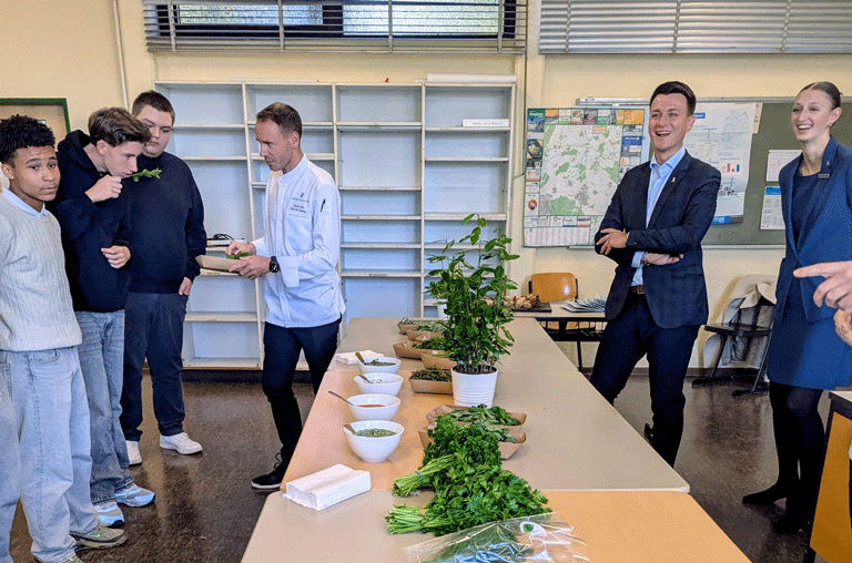 Das Hotel Ritz-Carlton aus Wolfsburg war mit fünf Mitarbeitenden aus dem Bereich Küche und Service gekommen. Die Köche brachten frische Küchenkräuter mit, die Schüler anhand von Schmecken, Anfassen und Riechen erkennen sollten.